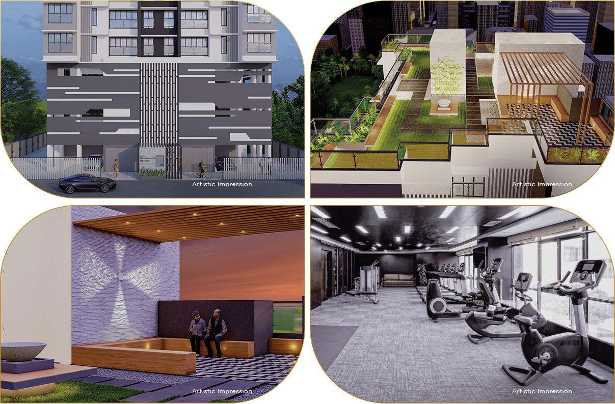 At Vijayi Jwala, you can enjoy calm pleasant mornings and amazing evenings with spectacular views of the cityscape from the rooftop walkway. The spacious fitness zone with a gymnasium & yoga zone allows you to stay fit forever . A place that is bonded by leisure to unwind, catch up and relax, the rooftop seating promises to be you and your family’s favourite hub . Whether you seek solitude or the company of friends, family, and neighbours, the green and serene surroundings are the perfect setting your soul needs.
